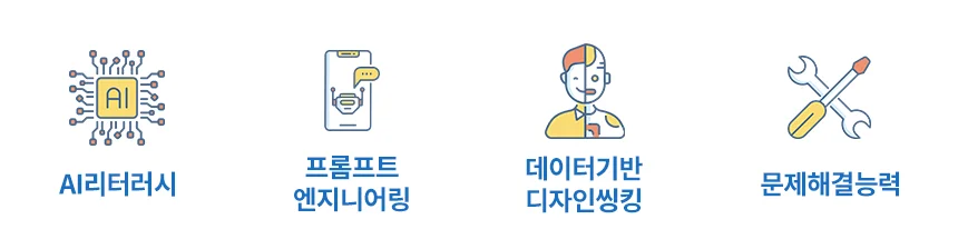 기업들이 경쟁력을 유지하고 시장의 변화에 대응하기 위해서는 임직원들에게 생성형 AI 및 관련 기술들에 대한 역량을 함양시키고 강화해야합니다. 특히 생성형 AI 역량향상을 위해서는 아래의 4가지 역량을 갖춰야 합니다. 이노핏파트너스는 디지털역량진단을 통해 현재 상황을 파악하고, 아래의 4가지 역량에 기반하여 기업의 산업과 비즈니스에 맞춰 커리큘럼을 디자인하여 제공합니다.