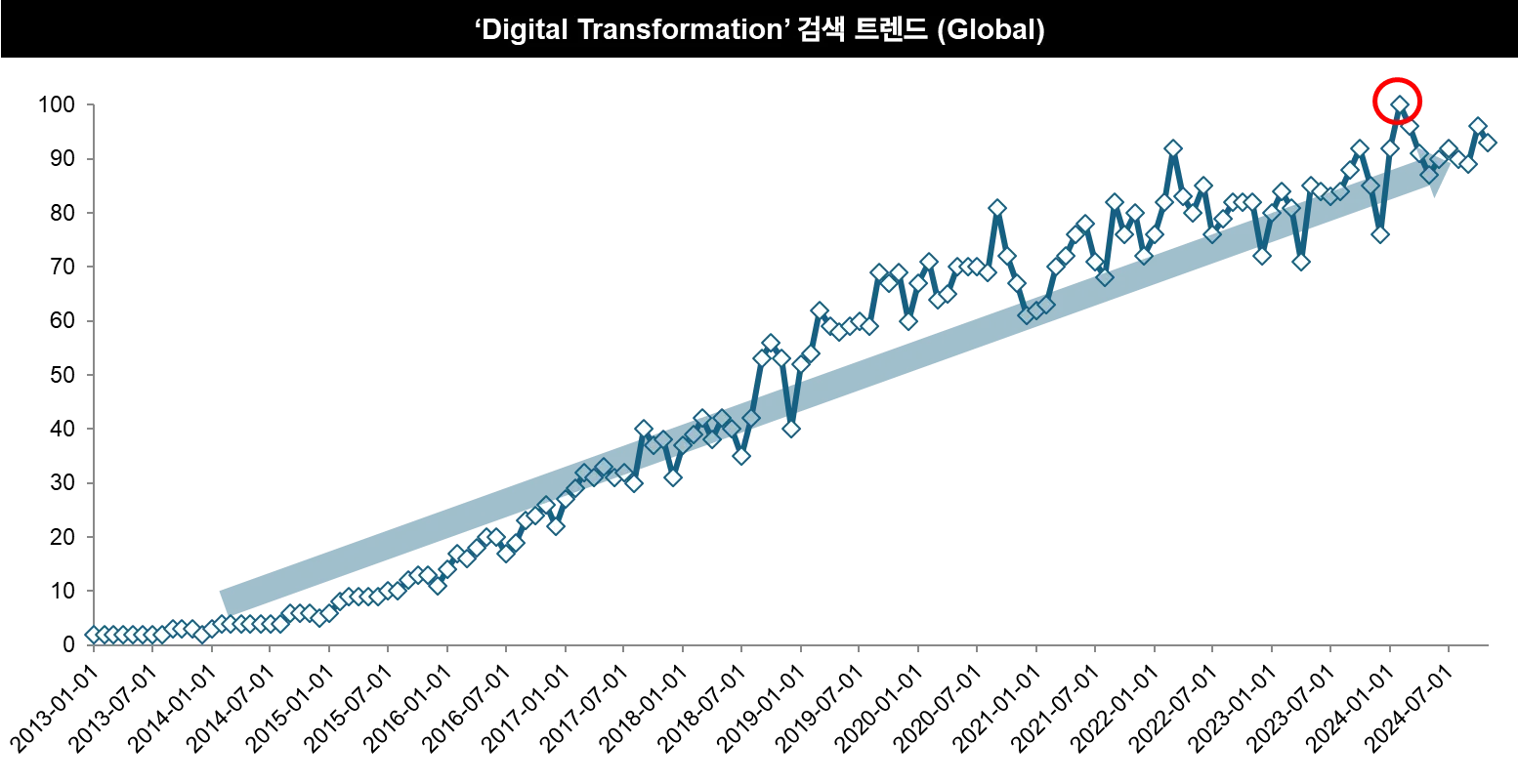 ‘Digital Transformation’이라는 용어가 본격 등장한지 약 10년이 넘었지만 글로벌 검색량이 여전히 정점을 갱신해가고 있는 현재진행형의 핵심 비즈니스 전략입니다.