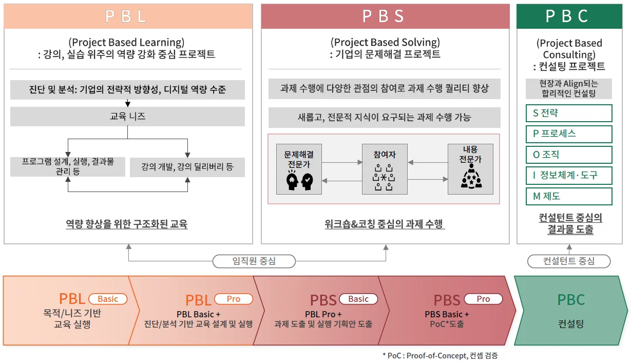 이노핏파트너스에서는 교육서비스를 PBL, PBS, PBC로 나누어 제공하고 있습니다.