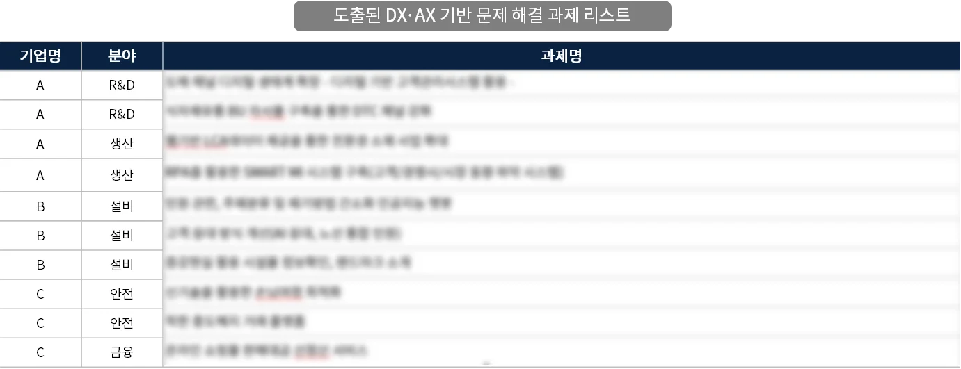 특히 이노핏파트너스의 문제 은행(문제 해결 과제 리스트)을 제공하여 실제 현업의 DX/AX 추진 과제 도출을 지원합니다.