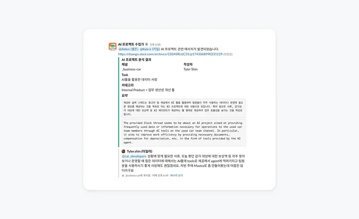 조직이 커질수록 다양한 팀에서 AI 프로젝트가 동시에 진행되는데, 정보를 공유하고 정리하는 일은 결코 쉽지 않습니다. 이를 해결하기 위해 전략지원팀과 인프라팀은 'AI 프로젝트 캐처'를 만들었습니다. 이 시스템은 슬랙에서 오가는 AI 관련 대화 내용을 자동으로 수집하고, 프로젝트 이름, 목표, 담당 팀 등의 정보를 한눈에 볼 수 있도록 정리해줍니다. 덕분에 조직 전반에서 어떤 AI 실험이 진행 중인지 투명하게 파악할 수 있고, 중복되는 시도를 줄일 수 있습니다.