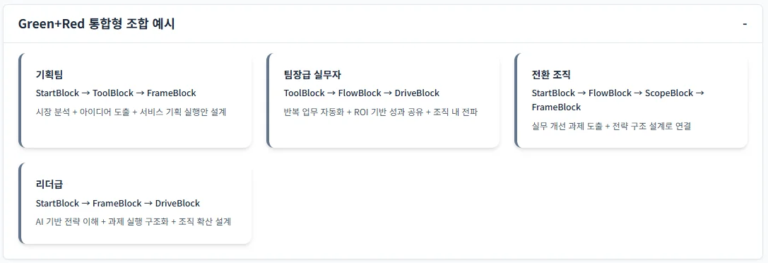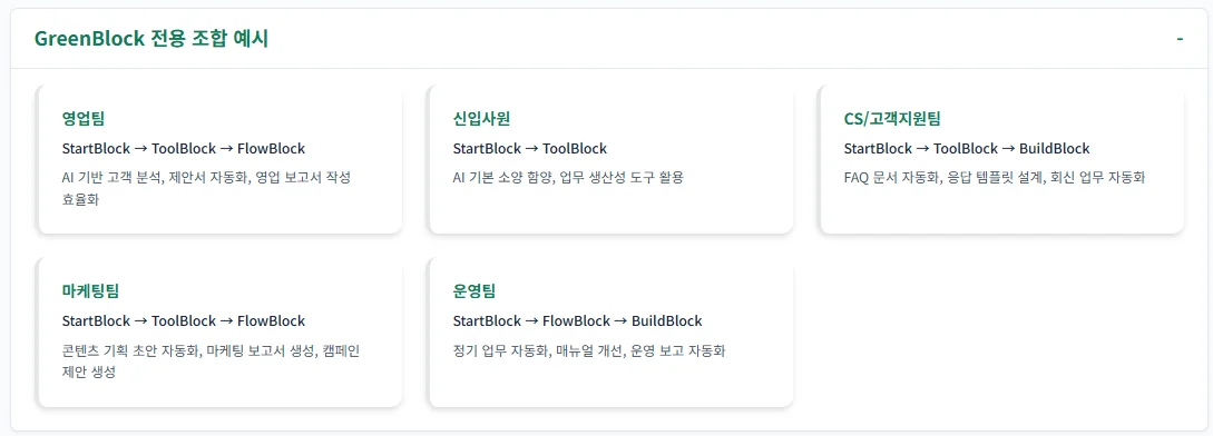 👉 GreenBlock 구성 중 StartBlock을 제외한 실습과 과제 중심 블록이 포함되었으며, 참여자는 문제정의와 실전 워크숍 중심으로 진행하였습니다.