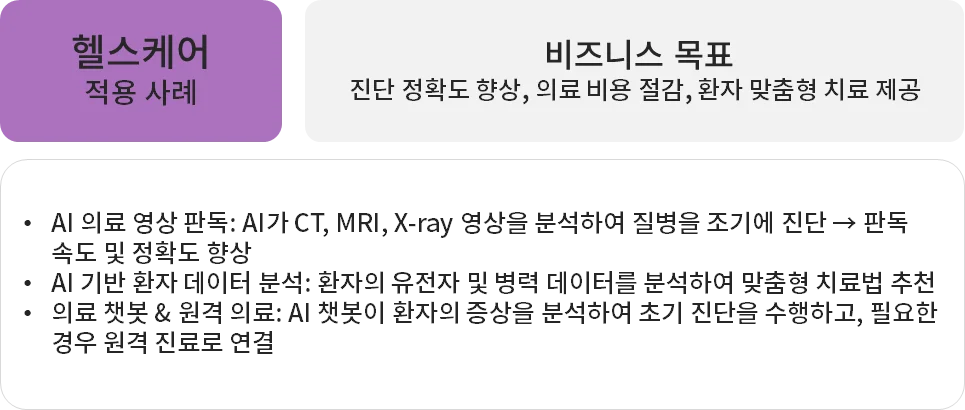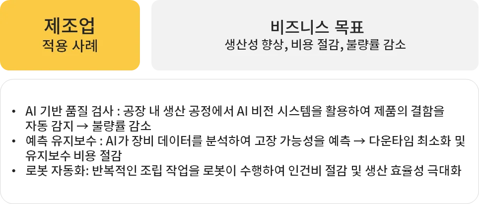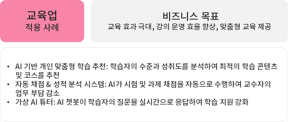 위의 내용과 같이 각 산업과 조직의 특성에 맞는 핵심 영역을 발굴해야 합니다. 이를 통해 AX가 단순한 기술 혁신이 아니라, 조직의 장기적인 전략과 연결되어야 합니다.