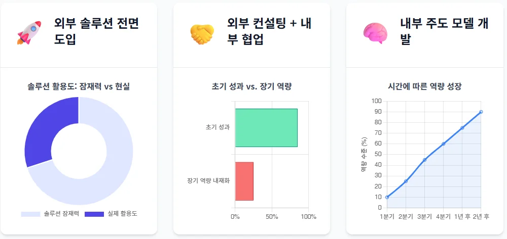 전문성과 경험을 빠르게 흡수할 수 있고, 단기간에 기획·모델링이 가능하다는 장점이 있습니다. 그러나 예측 결과를 사용하는 부서가 별도로 존재하고, 운영이 컨설턴트 주도일 경우 실제 조직에 남는 역량이 적고, 반복 학습이 일어나지 않습니다.예: 컨설팅 이후 보고서는 남았지만, 이후엔 파일이 활용되지 않음