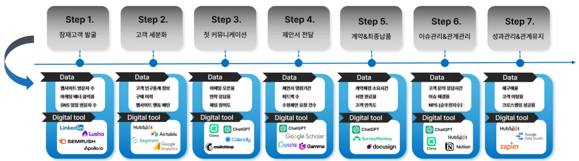 이 7단계는 단순한 '영업 기술'은 아닙니다. 고객과의 관계를 '처음부터 끝까지' 디지털 환경에서 끊김 없이 이어가는 전략적 과정입니다.