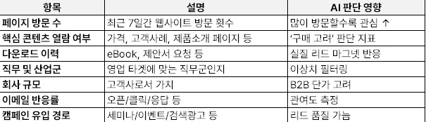 아래는 리드 스코어링 모델에서 사용되는 주요 변수(예)입니다.
