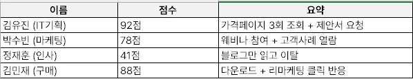 AI가 도출한 리드 스코어(예) : 이 표에서 AI는 김유진, 김민재를 상위 우선 리드로 분류하고, 정재훈은 보류 혹은 자동 리타게팅 캠페인으로 분류하게 됩니다.