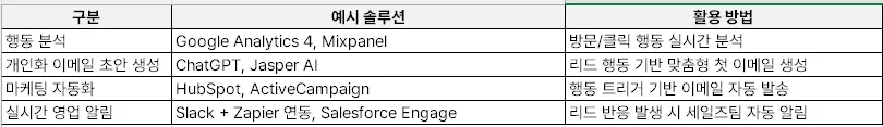 3) 리드 반응률 추적 및 최적화 → 오픈율/클릭율 데이터 트래킹 후 톤과 CTA 튜닝. 답변 유도보단 '추가 자료 제공' 어조로 첫 접촉 구성 시 반응률 증가