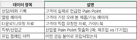 예) 활용할 수 있는 데이터 : 웹사이트 이벤트, 폼 작성, 광고 클릭 로그