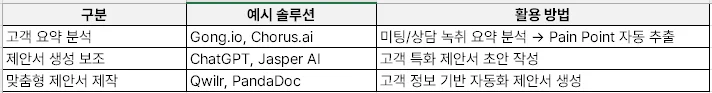 3) 제안서 포맷 다변화 → 산업별/직무별(관리자vs실무자) 포맷 다르게 저장해두고 고객별 맞춤화