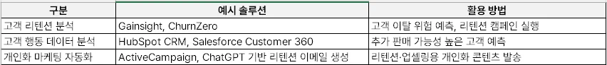 예) 적용 AI/솔루션: Salesforce Einstein Lead Scoring, ChatGPT 기반 세그먼트별 스크립트 초안